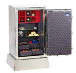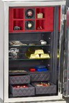 - Coffre-fort finition inox, interieur en cuir gris/bleu surpiqué de rouge, tiroirs tapissées d'alcantara rouge " goya ".